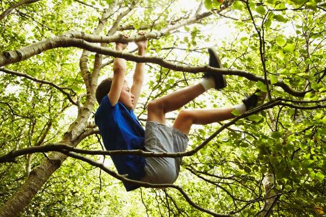 21 Aug 2012 — portrait of a teenager climbing and hanging in a tree in a birch wood, backlit — Image by © Silke Woweries/Corbis